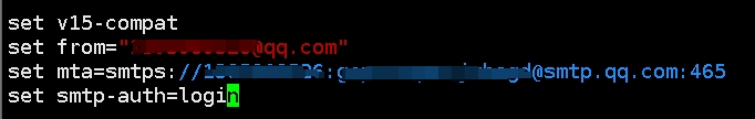 6.vim编辑 s-nail.rc文件,在文件末尾写如下四行信息,其中打码部分分别为QQ号,QQ号,授权码