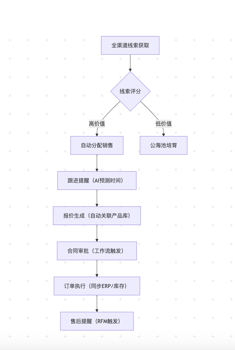 flowchart TD A[全渠道线索获取] --> B{线索评分} B -->|高价值| C[自动分配销售] B -->|低价值| D[公海池培育] C --> E[跟进提醒(AI预测时间)] E --> F[报价生成(自动关联产品库)] F --> G[合同审批(工作流触发)] G --> H[订单执行(同步ERP/库存)] H --> I[售后提醒(RFM触发)]