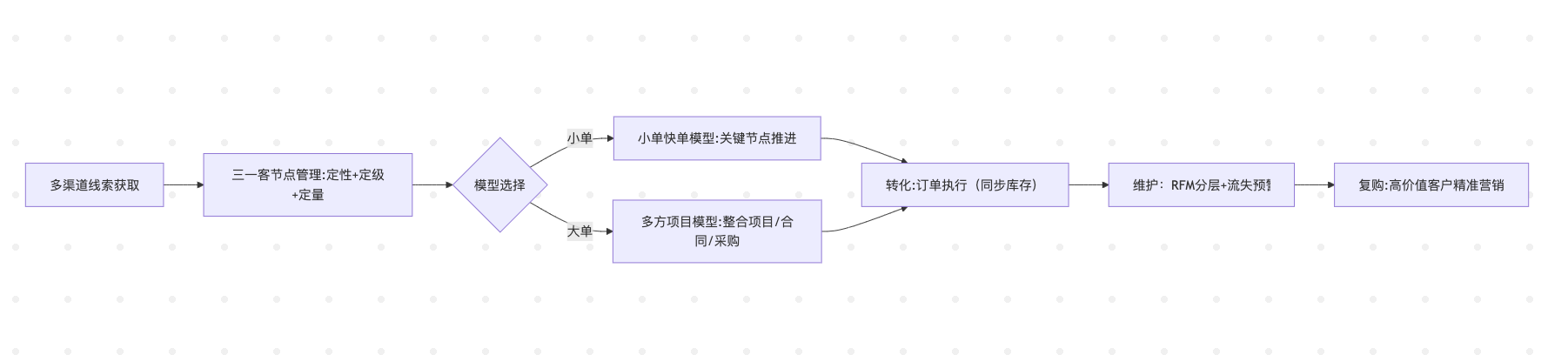 flowchart LR A[多渠道线索获取] --> B[三一客节点管理:定性+定级+定量] B --> C{模型选择} C -->|小单| D[小单快单模型:关键节点推进] C -->|大单| E[多方项目模型:整合项目/合同/采购] D --> F[转化:订单执行(同步库存)] E --> F F --> G[维护:RFM分层+流失预警] G --> H[复购:高价值客户精准营销]