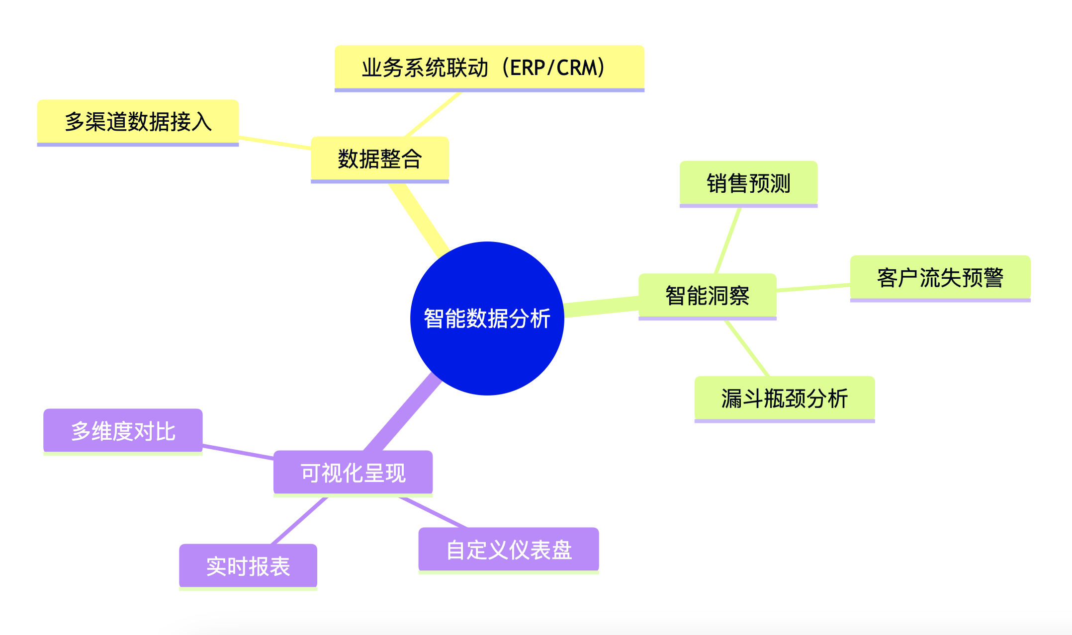 mindmap root((智能数据分析)) 数据整合 多渠道数据接入 业务系统联动(ERP/CRM) 智能洞察 销售预测 客户流失预警 漏斗瓶颈分析 可视化呈现 自定义仪表盘 实时报表 多维度对比