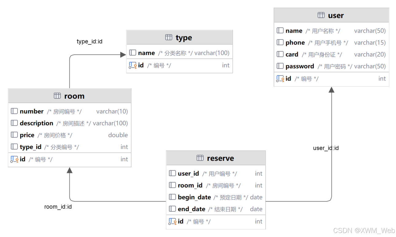 换成面相对象的思维来思考:旅馆中有旅客类(旅客的名字+手机号+身份证+用户密码)、服务类(提供的服务)、房间类(房间编 号+房间描述+价格+分类编号)