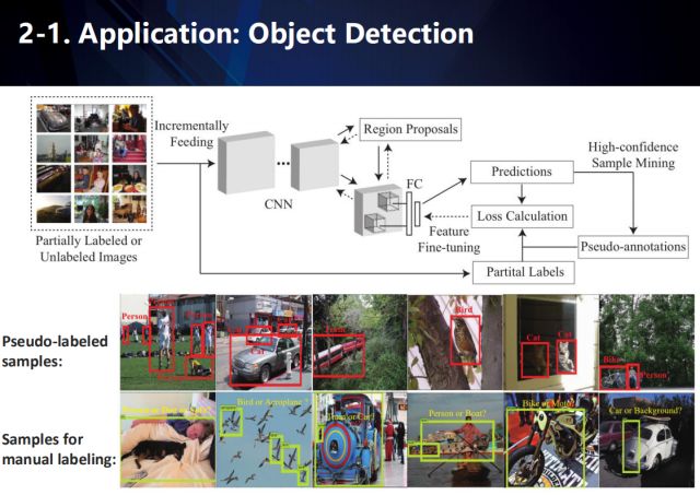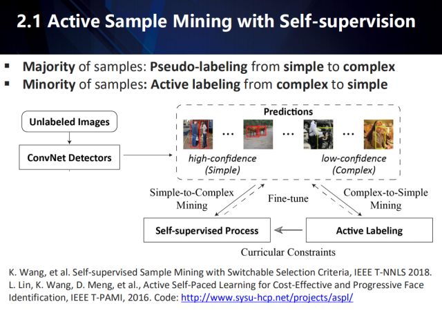 这类方法受到人类学习模式的一些启发:一是在逐步整合学习到的知识中自我探索,二是在交流的过程中不断扩充知识,以达到终生学习的目的。如上图所示,在学习的初期,利用已有的标注数据进行初始化学习,然后在大量未标注的数据中不断按照人机协同方式进行样本挖掘,以增量地学习模型和适配未标注数据。
