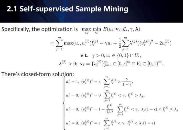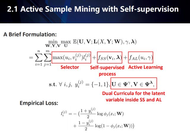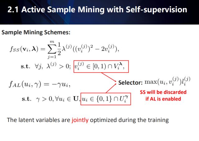 模型函数 f_SS代表了一种贪心的自监督的策略。它大大地节省了人工标注量,但是对于累计预测误差造成的语义恶化无能为力。并且,f_SS极大依赖于初始参数 W。由于模型函数 f_AL存在,我们可以有效地克服这些缺点。f_AL选择样本给用户进行后处理,通过f_AL获得的人工标注被认为是可靠的,这种过程应该持续到训练结束。值得一提的是,通过 f_SS进行的伪标注只有在训练迭代中是可靠的,并且应该被适当的调整来引导每个阶段更鲁棒的网络参数的学习。实际上,f_SS和f_AL是同时作用与每一个样本的,这会等价于一个minimax的优化问题。