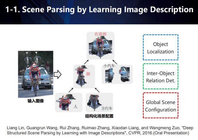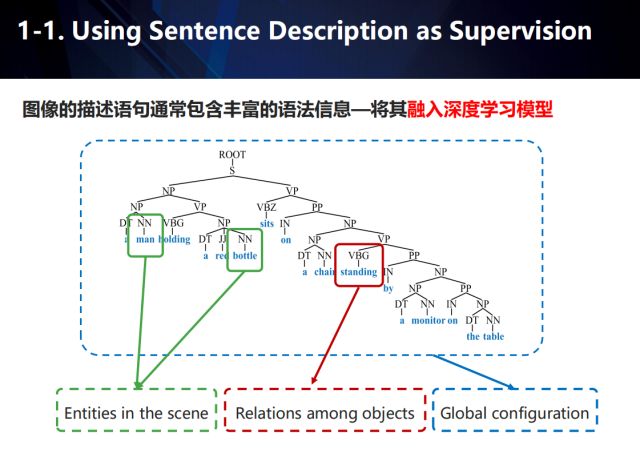 而图像的描述语句通常包含丰富的语法信息,如果能将这些信息融入深度学习模型,那么可以将其看作一种辅助的监督手段。以对图像描述这一应用为例,如图所示,我们用绿色框表示场景中出现的实体,红色框表示实体之间的关系,而蓝色框表示场景的全局配置结构。