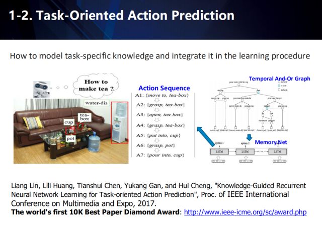 此外,在面向任务的动作预测中, 同样可以采用弱监督学习的方式来解决需要大量标注信息的问题。这一工作获得了The World’s First 10K Best Paper Diamond Award by ICME 2017.
