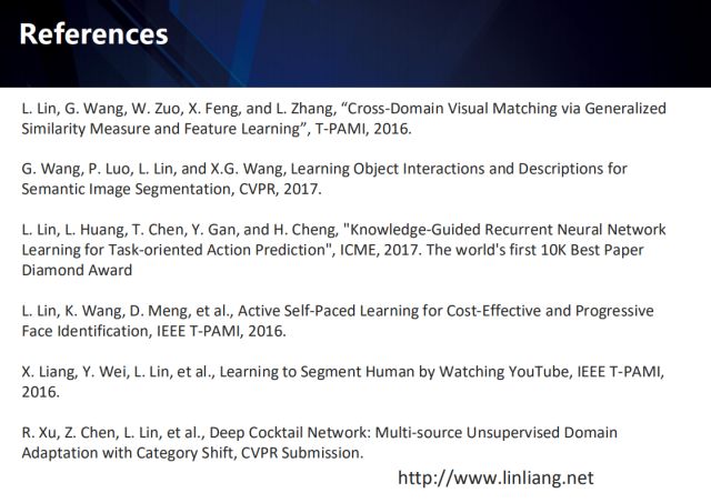 林倞,国家万人计划青年拔尖人才,国家优秀青年基金获得者,教育部超算工程软件工程研究中心副主任,IET Fellow。先后在美国加州大学洛杉矶分校、香港中文大学等机构工作或访问研究。长期从事面向视觉大数据的语义分析与智能学习相关领域的研究,并且在商汤科技的一系列产品中应用落地。迄今在国际学术期刊与会议上发表论文100余篇,包括PAMI/IJCV期刊论文12篇,CVPR/ICCV/NIPS等会议论文40余篇,3篇论文成为ESI高被引论文。获得NPAR 2010最佳论文奖,2012 Google Faculty Award,2017年度World's FIRST 10K Best Paper Diamond Award by IEEE ICME,2014 Hong Kong Scholars Award,率队获得2016英特尔杯全国并行应用挑战赛金奖;指导学生获得ACM中国区优秀博士论文奖(每年度2名)、中国计算机学会优秀博士论文奖。曾在CCF-A类会议ACM Multimedia,CVPR做大会教程报告(Tutorial)。担任知名期刊IEEE Trans. Human-Machine Systems、Neurocomputing、The Visual Computer的副编辑/编委,曾担任IEEE ICME、ACCV、ACM ICMR等国际会议的领域/专题主席。任中国计算机学会多媒体技术专委会常务委员、中国计算机学会计算机视觉专委会委员、中国自动化学会模式识别与机器智能专委会委员、中国图象图形学会青年工作委员会委员。欢迎访问个人主页http://www.linliang.net。