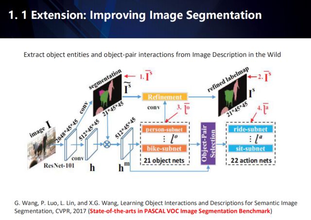 还可以扩展到图像语义分割领域。这一工作发表在CVPR2017,目前在PASCAL VOC数据集上做到了state-of-the-arts。