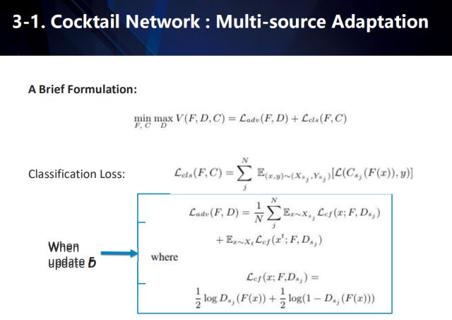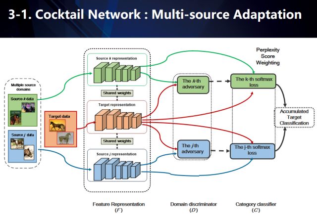鸡尾酒网络用于学习基于多源域(我们的图示仅简化地展示了j,k两个源域)下的域不变特征(domain invariant feature)。在具体数据流中,我们利用共享特征网络对所有源域以及目标域进行特征建模,然后利用多路对抗域适应技术(基于单路对抗域适应(adversarial domain adaptation)下的扩展,对抗域适应的共享特征网络对应于生成对抗学习(GAN)里面的生成器),每个源域分别与目标域进行两两组合对抗学习域不变特征。同时每个源域也分别进行监督学习,训练基于不同源类别下的多个softmax分类器。注意到,基于对抗学习的建模,我们在得到共享特征网络的同时,也可以得到多个源分别和目标域对抗的判别器。这些判别器在对于每一个目标域的数据,都可以给出该数据分别与每一个源域之间的混淆度(perplexity score)。因此,对于每一个来自目标域的数据,我们首先利用不同源下的softmax分类器给出其多个分类结果。然后,基于每一个类别,我们找到包含该类别的所有源域softmax分类概率,再基于这些源域与目标域的混淆度,对分类概率取加权平均得到每个类别的分数。简而言之就是,越跟目标域相识的源域混淆度会更高,意味着其分类结果更可信从而具有更高的加权权值。