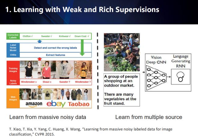 而值得注意的是,深度学习在计算机视觉领域的成功应用,很大程度上依赖于有监督的数据,这意味着大量的完全标注的干净数据(例如人脸识别领域的数据)。然而,这样的数据意味着非常高昂的成本。在真实的场景中,经常存在的是弱监督或者从互联网上获取的数据(例如网络社交媒体的数据),以及无标注或者标注有噪声的数据(例如智慧城市以及自动驾驶等应用中采集到的数据)。