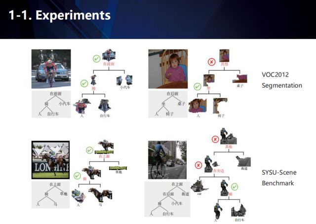 语义分割和场景结构化解析在PSACAL VOC 2012 和 SYSU-Scene 评测集上的实验结果展示如图。