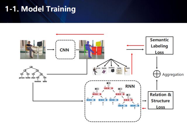 本方法在学习过程中有两个输入,一个是图像,另外一个图像对应的解析句子,将图像输入CNN,得到图像的实体类特征表达,同时利用语义解析生成树方法将句子分解成语义树,并将图像得到的实体类与语义生成树一同输入到RNN网络中,利用图像的语义标注与关联结构树进行训练,从而得到预期的结果。