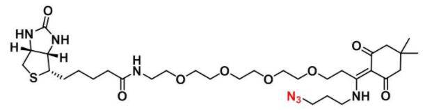Dde生物素-PEG4-叠氮化物可用于使用Cu(I)催化的点击化学将生物素部分引入含炔烃的生物分子。亲水性间隔臂在水介质中为标记分子提供更好的溶解性。Dde保护组允许在温和的联氨条件下从链霉亲和素中有效释放捕获的生物素化分子。