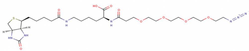 产品简介:N-(叠氮-PEG4)-生物素是一种含有羧基和叠氮基的生物素-PEG连接物。羧基与伯氨基(-NH2)的反应形成稳定、不可逆的酰胺键。叠氮化物可以与Cu(I)催化的Click化学反应中的炔烃部分或无铜Click化学反应中的DBCO部分反应,形成稳定的三唑键。亲水性PEG间隔物增加了与生物素化合物共轭的分子在水介质中的溶解度。