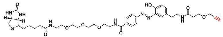 产品简介:重氮生物素-PEG3-炔可用于使用Cu(I)催化的点击化学将生物素部分引入含叠氮化物的生物分子。亲水性间隔臂在水介质中为标记分子提供更好的溶解性。重氮允许使用连二亚硫酸钠(Na2S2O4)从链霉亲和素中高效释放捕获的生物素化分子。