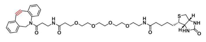 产品简介:DBCO-PEG4-生物素是一种点击化学生物素化学试剂,可使叠氮化物分子的无铜点击化学形成稳定的三唑键。PEG4间隔基增加了与生物素化合物共轭的分子的水溶性。