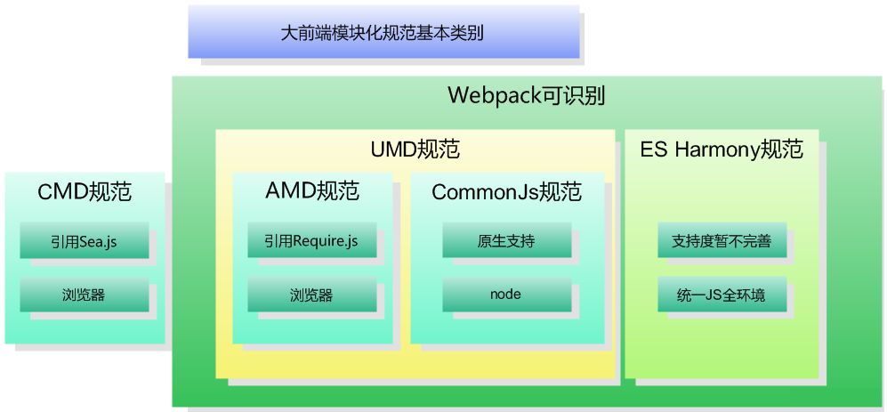 webpack默认支持的是CommonJs规范,毕竟它是nodejs支持的模块管理方式,而没有node哪来的webpack。但同时为了扩展其使用场景,webpack在版本迭代中也加入了对ES harmony规范和AMD规范的兼容。