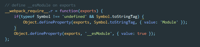 这个方法是给模块的exports对象加上ES Harmony规范的标记,如果支持Symbol对象,则为exports对象的Symbol.toStringTag属性赋值Module,这样做的结果是exports对象在调用toString方法时会返回’Module’(笔者并没有查到这种写法的缘由);如果不支持Symbol对象,则将exports.__esModule赋值为true。