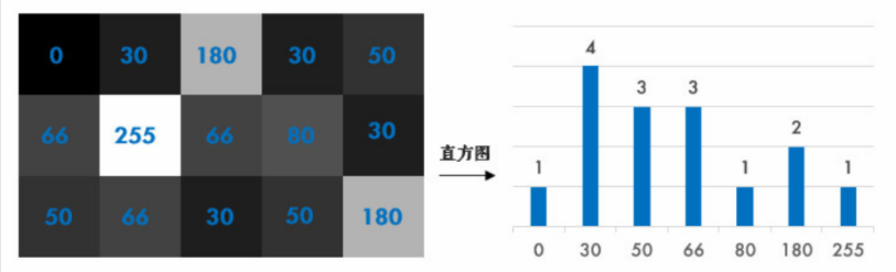 直方图就是对图像中每个像素值进行频数统计,绘制成柱状统计图,x轴是灰度值,y轴是每个灰度出现的频次。
