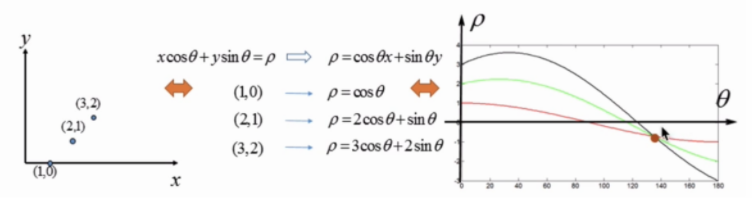 如果霍夫空间中有很多线相交于一点,表示可以找到原始空间中很多点构成的一条线。