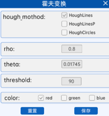 theta:极角 θ的密度,值越大表示在单位面积内累加器格子的数量越大,常见的范围是0到π,建议选择π/180,即1度
