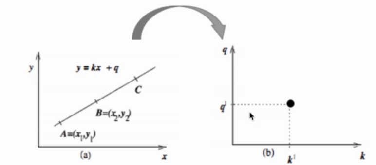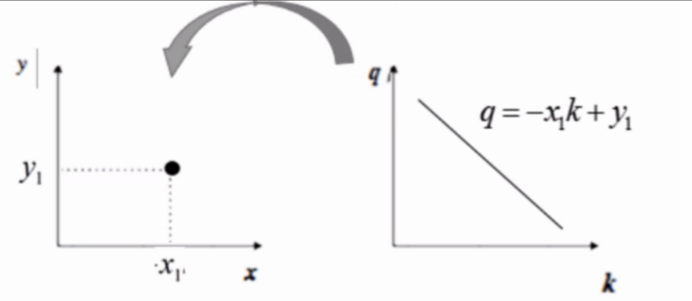 原始空间的直角坐标系下一条无限长的直线对应了霍夫空间中的一个点,霍夫空间的一条直线对应了原始空间的直角坐标中的一个点。