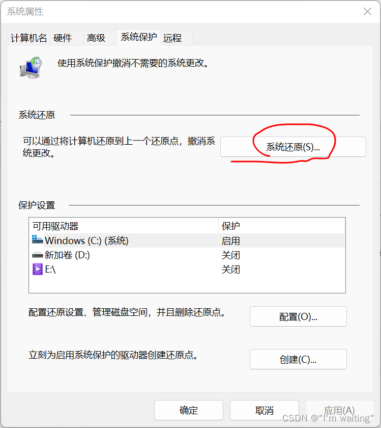 【此电脑->属性->高级系统设置->系统保护->系统还原】
