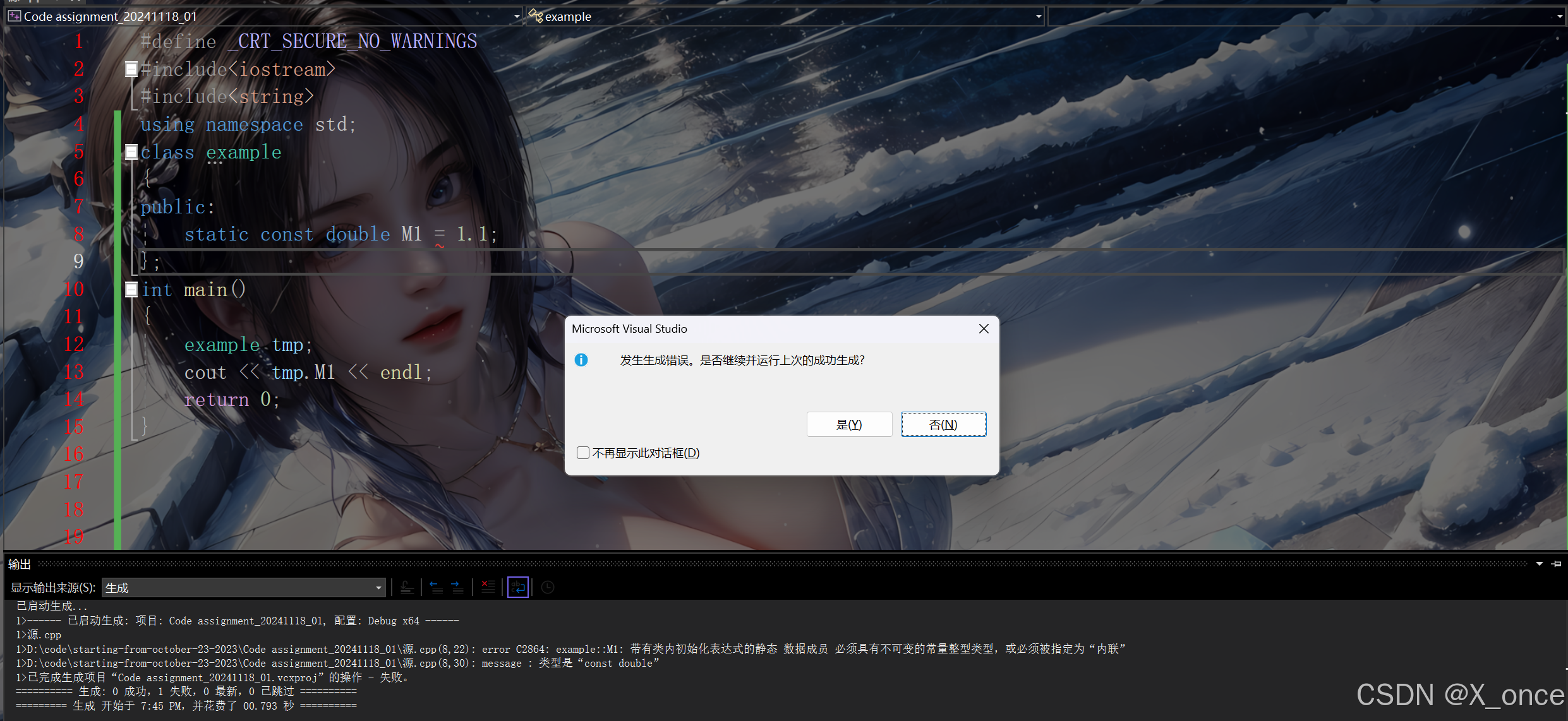 为什么可以这样呢?可以认为是规定吧。主要是被const修饰了,是常变量了,无法修改了。但是很奇怪的是,只有整形家族的static const变量可以在声明处给缺省值就相当于定义了,不是整形家族的静态成员变量还得在类外面定义,哪怕是被const修饰了的。例如: