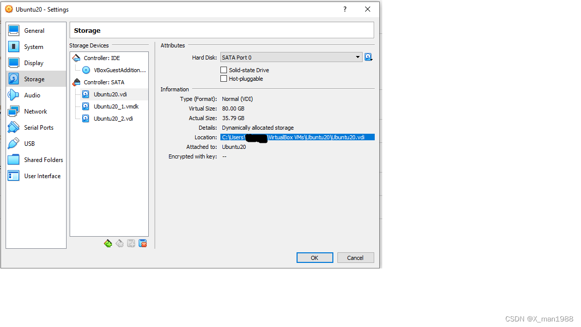 2. 找到虚拟机的硬盘,并记录下它的位置和大小。您可以在“存储”选项卡下找到它。