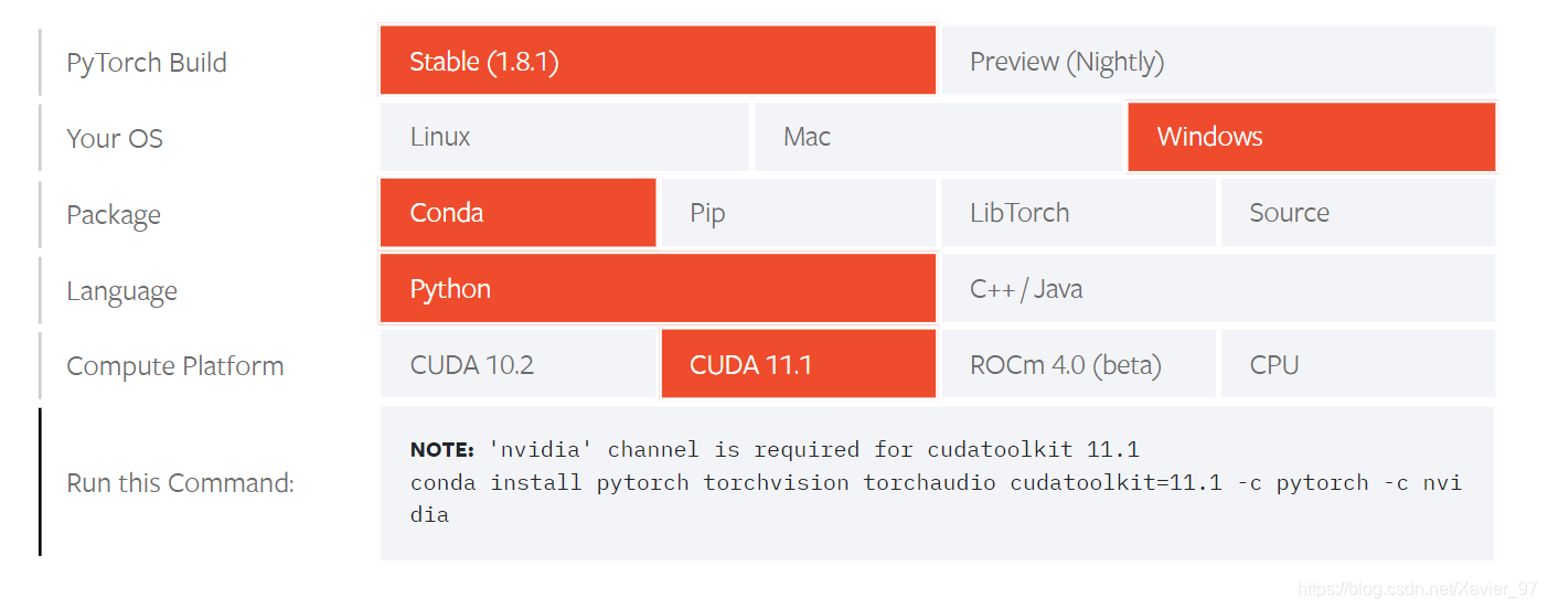 今天给新电脑装pytorch的时候查到MX450驱动的CUDA版本是11.1,于是兴冲冲跑去pytorch官网找到安装命令准备安装