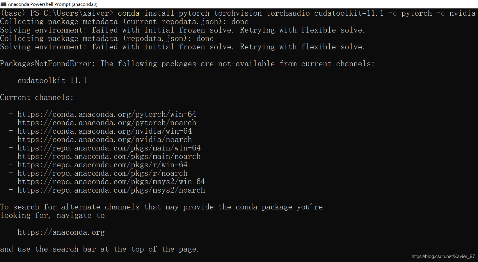 还特别叮嘱我:'nvidia' channel is required for cudatoolkit 11.1,结果执行就报错如下