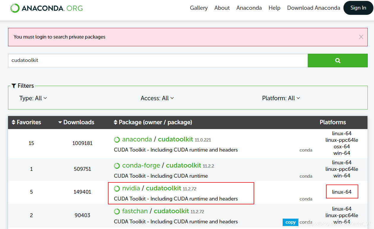 加了清华源下载还是没用,然后最后去anaconda官网一搜,找到原因了,原因是在在指定的nvidia通道中(-c nvidia)只有linux-64版本的包,没有windows的,官网命令把我给坑了