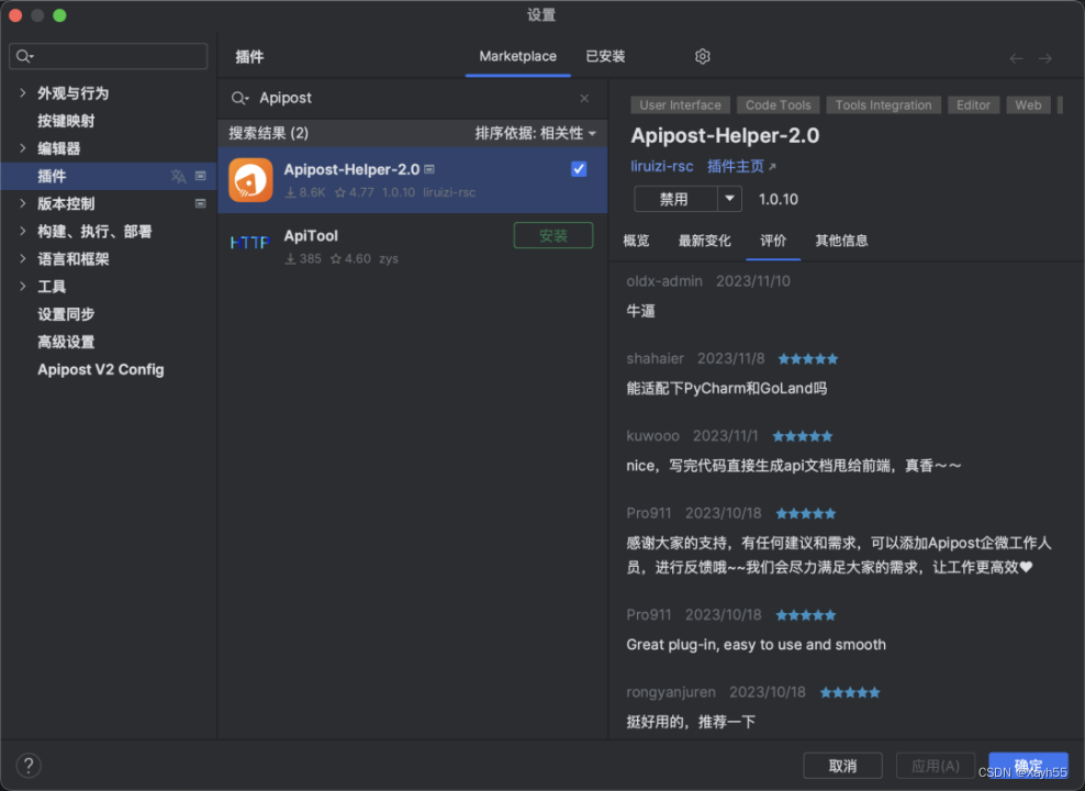 这款插件由Apipost团队开发的,其官方介绍是:用于IDEA项目快速生成API文档,快速查询接口、接口代码功能,并支持在IDEA中进行API调试操作。在IDEA编辑器插件中心输入Apipost 搜索安装: Apipost-Helper-2.0
