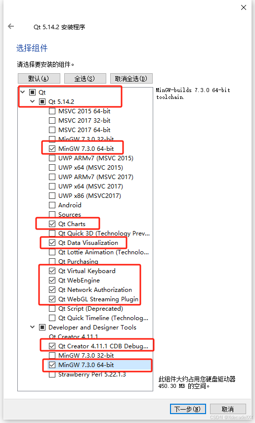 4.在Windows平台上,如果仅使用Qt开发PC端,勾选组件参考下面的图,如果有其它需求,可百度搜索组件相关介绍;勾选完组件,然后点击“下一步”。