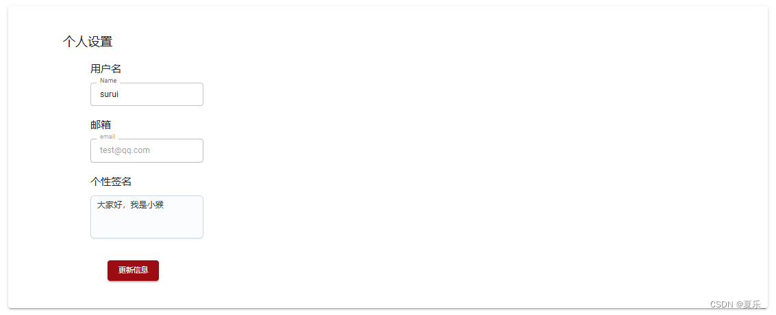 使用useState管理组件状态,包括用户信息【名字,邮箱,个性签名】、头像和密码。