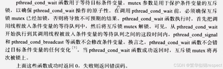 pthread_cond_wait(&cond,&mutex);//阻塞-->调用后函数内部会先进行解锁操作,当成功返回后会进行加锁操作,故在使用前要先进行加锁,使用后要进行解锁