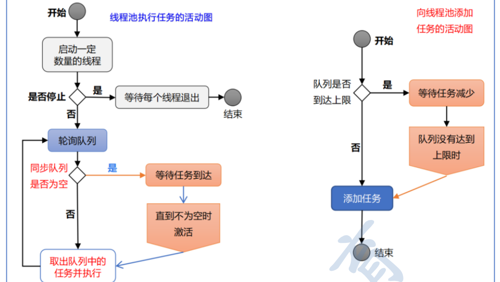从活动图中可以看到线程池的活动过程,一开始线程池会启动一定数量的线程,这些线程属于异步层,主要用来并行处理排队层中的任务,如果排队层中的任务数为空,则这些线程等待任务的到来,如果发现排队层中有任务了,线程池则会从等待的这些线程中唤醒一个来处理新任务。