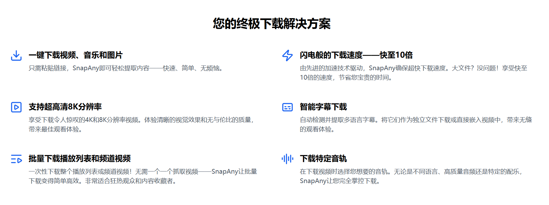 今天向大家推荐的是一款视频解析下载软件,名字叫做snapany。这款软件完全免费,并且没有广告,支持国内外10000+网站视频和图片的下载,使用方式也十分简单,复制链接,粘贴下载即可。软件版本包含Windows和Mac版,同时也可以在线使用。下面简单介绍一下界面和功能。
