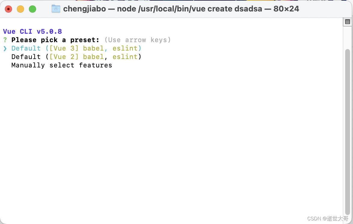 这个让你进行一个选择。 这个演示的时候在直接在终端进行了,实际上是在ide下面的控制台等等中执行,或者可以在你想要创建的目录下面使用终端进行创建等等。vue create 项目名字