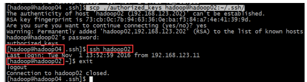 e) 将该授权文件 authorized_keys 文件复制到 slave 节点 scp ./authorized_keys hadoop@hadoop02:~/.ssh/