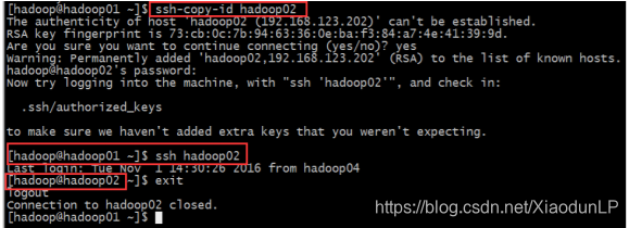 c) 使用一个更简单的方式,使用命令: ssh-copy-id hadoop02 建立 hadoop01 到 hadoop02 的免密登录
