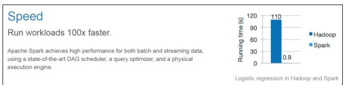 基于以上所列举的优化,Spark 官网声称性能比 Hadoop 快 100 倍。即便是内存不足需要磁 盘 I/O 时,其速度也是 Hadoop 的 10 倍以上。