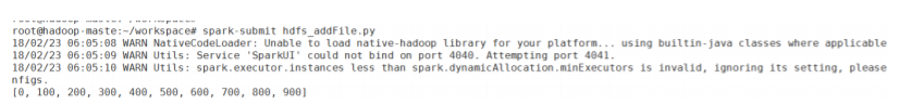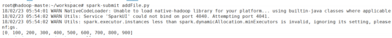 新建addFile.py文件,内容如下: from pyspark import SparkFiles import os import numpy as np from pyspark import SparkContext from pyspark import SparkConf tempdir = '/root/workspace/' path = os.path.join(tempdir,'num_data') with open(path,'w') as f: f.write('100') conf = SparkConf() conf.set('master','spark://hadoop-maste:7077') context = SparkContext(conf=conf) context.addFile(path) rdd = context.parallelize(np.arange(10)) def fun(iterable): with open(SparkFiles.get('num_data')) as f: value = int(f.readline()) return [x*value for x in iterable] print(rdd.mapPartitions(fun).collect()) context.stop()运行spark-submit addFile.py