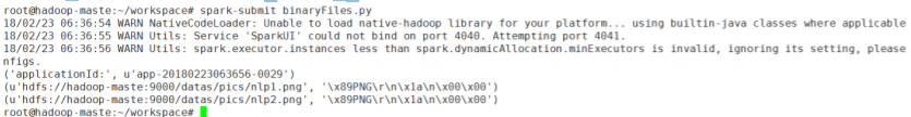 新建binaryFiles.py文件,内容如下: from pyspark import SparkContext ,SparkConf import numpy as np conf = SparkConf() conf.set('master','spark://hadoop-maste:7077') context = SparkContext(conf=conf) rdd = context.binaryFiles('/datas/pics/') print('applicationId:',context.applicationId) result = rdd.collect() for data in result: print(data[0],data[1][:10]) context.stop()运行spark-submit binaryFiles.py