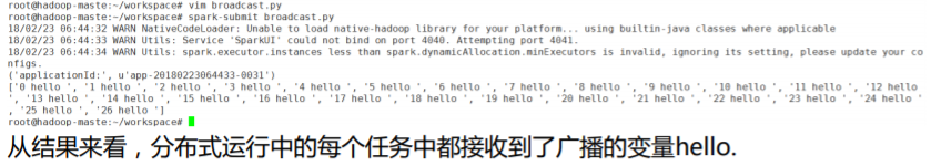 from pyspark import SparkContext ,SparkConf import numpy as np conf = SparkConf() conf.set('master','spark://hadoop-maste:7077') context = SparkContext(conf=conf) broad = context.broadcast(' hello ') rdd = context.parallelize(np.arange(27),3) print('applicationId:',context.applicationId) print(rdd.map(lambda x:str(x)+broad.value).collect()) context.stop()运行spark-submit broadcast.py