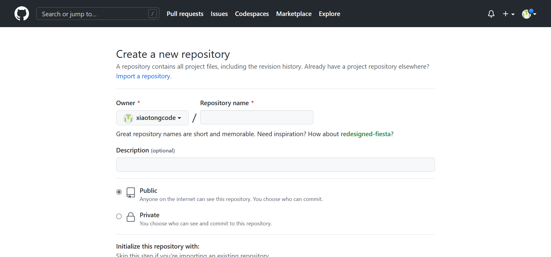 仓库名字:Yourname.github.io,意思就是你的名字+.github.io,例如我就是xiaotongcode.github.io