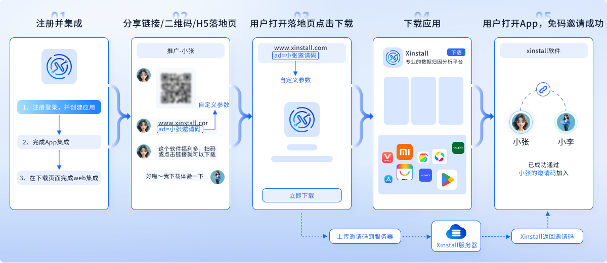 最好的广告,来自朋友的推荐。设计一个让用户“乐于分享”且“分享即有回报”的裂变机制,促进口碑传播。为加强分享动力,可以让邀请者和被邀请者都获得奖励(如优惠券、会员天数、高级功能等),并保证活动页面能流畅使用。Xinstall的深度链接和传参功能,能简化新用户注册流程,助力更低成本的APP获客路径。