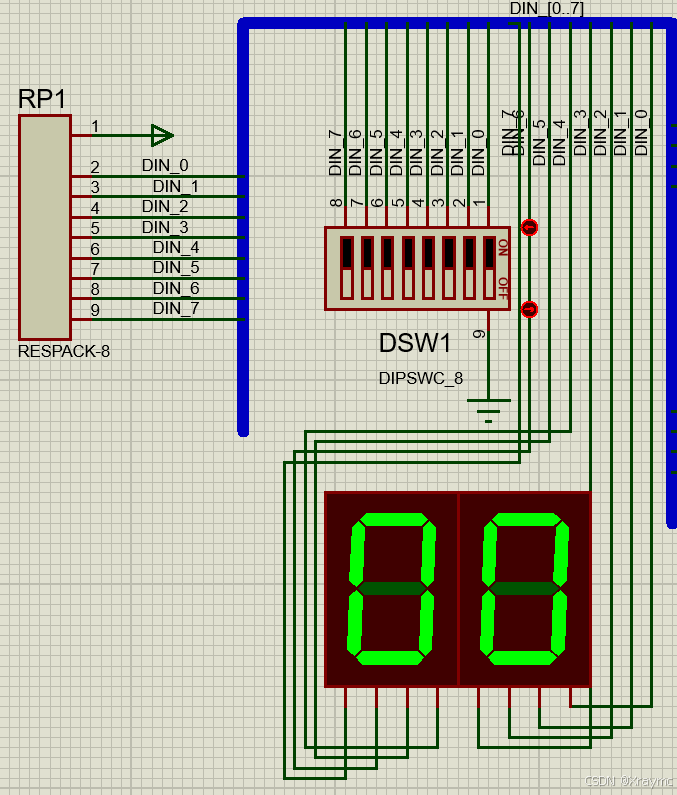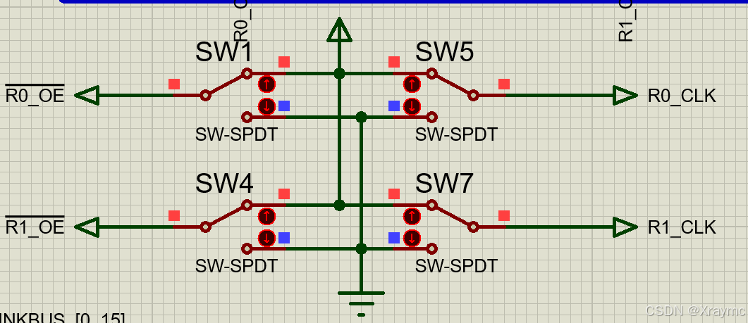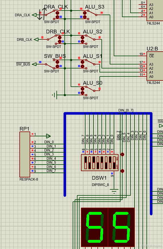 观察此电路,有三个地方含有开关或选择开关原件,注意观察选择开关的颜色,红色为高电平,记为1,蓝色为低电平,记为0.