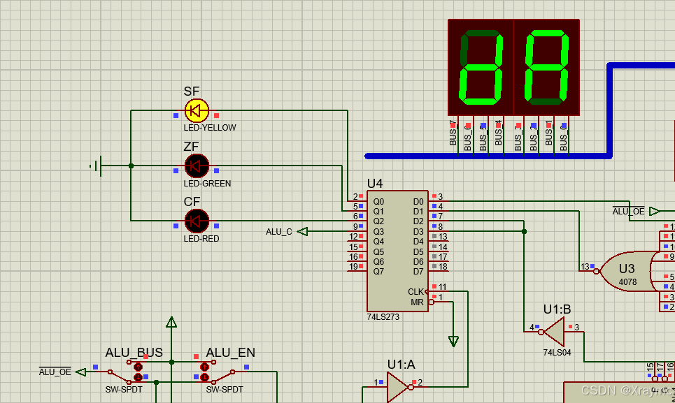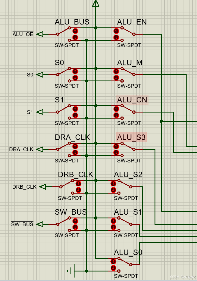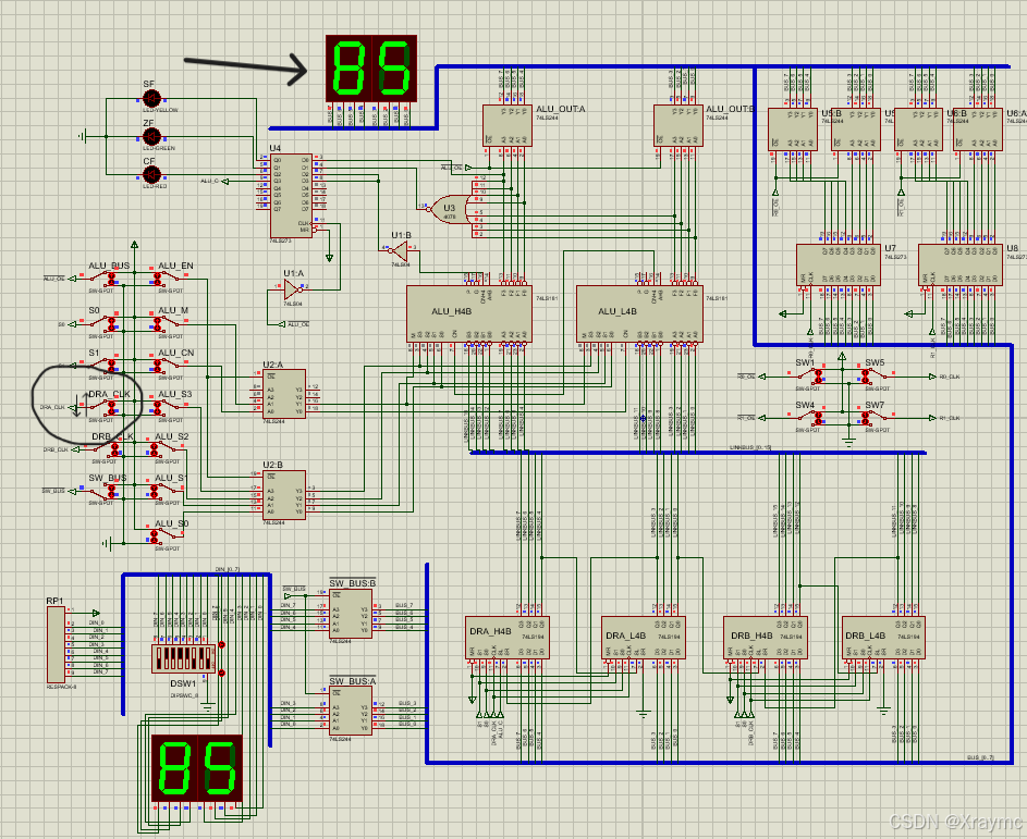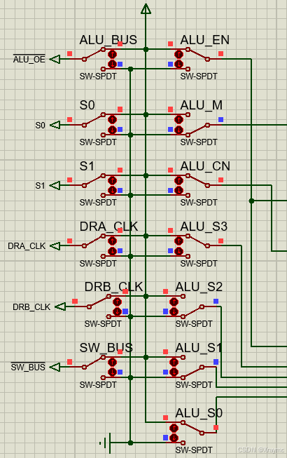 ALU_S0~S3对应了真值表中的S0~S3,ALU_CN对应了真值表中的CN位,ALU_M对应了真值表中的M;S0和S1在实验中置为高电平即可,我也没搞懂它俩存在的意义;SW_BUS是总线开关,SW_BUS=0时,NOT(SW_BUS)=1,总线正常工作,数据才能输入进去;DRA_CLK和DRB_CLK是缓存器DRA和DRB的开关,它们可以将输入的数据(A和B)存进去;ALU_EN是让运算器输出结果的开关,当ALU_EN=1时,运算的结果才能输出到总线上(划重点,后面很重要);ALU_BUS可以把它理解为输出端的开关,打开它上面才会显示出运算的结果。