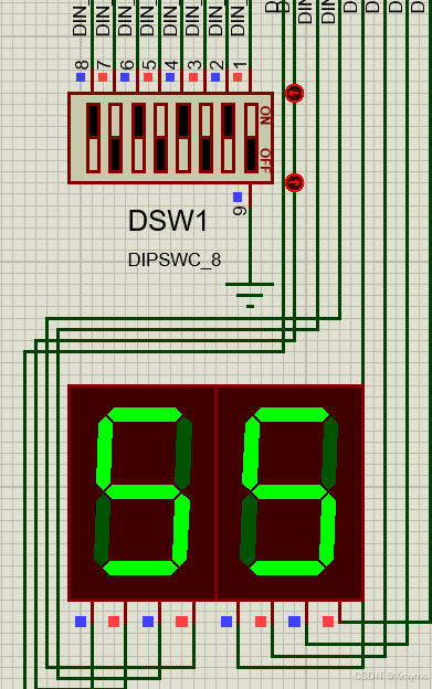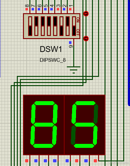 上面的开关起到一个输入数据的作用,开关的ON和OFF分别代表了0和1,前四个开关对应第一位,后四个开关对应第二位。