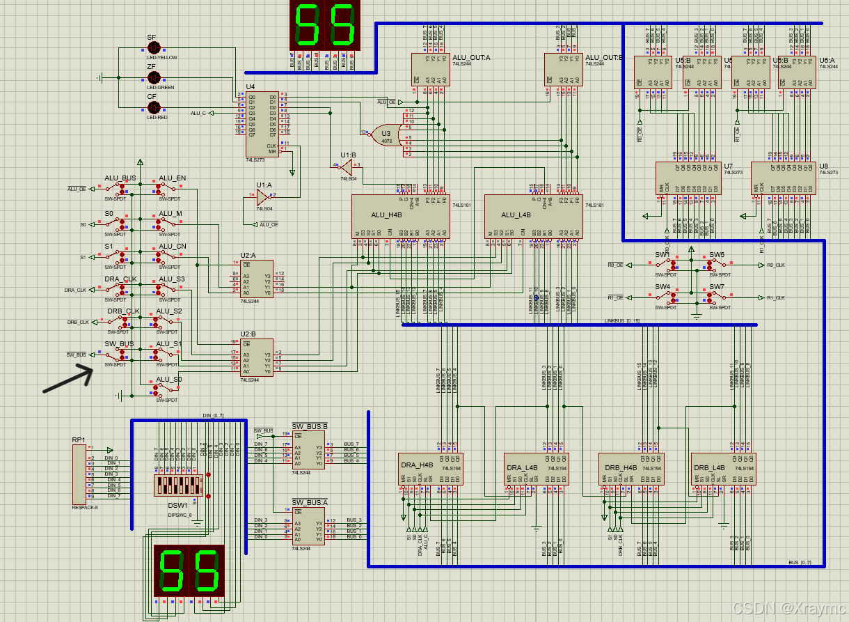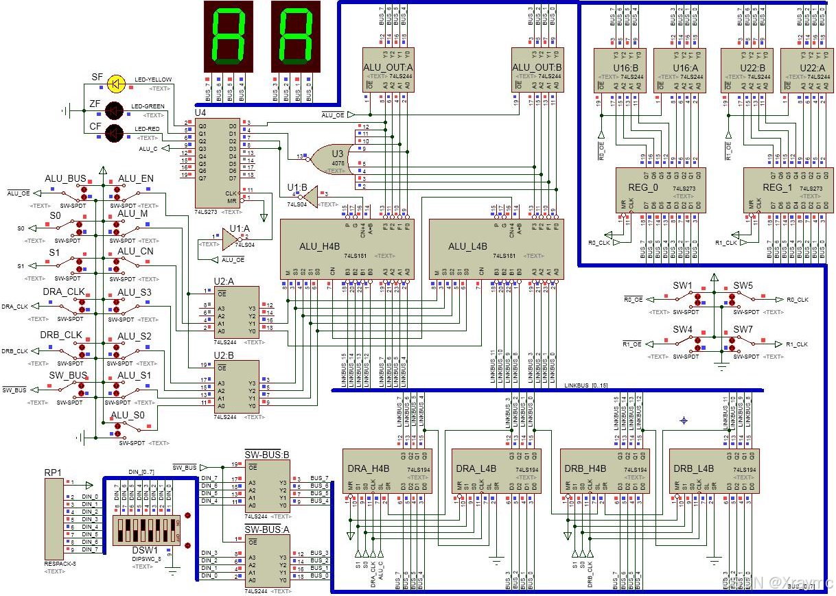 本实验来源于西工大网安学院计算机组成原理课程的第一次实验任务,具体内容为搭建电路并实现各种运算功能。电路图如下: